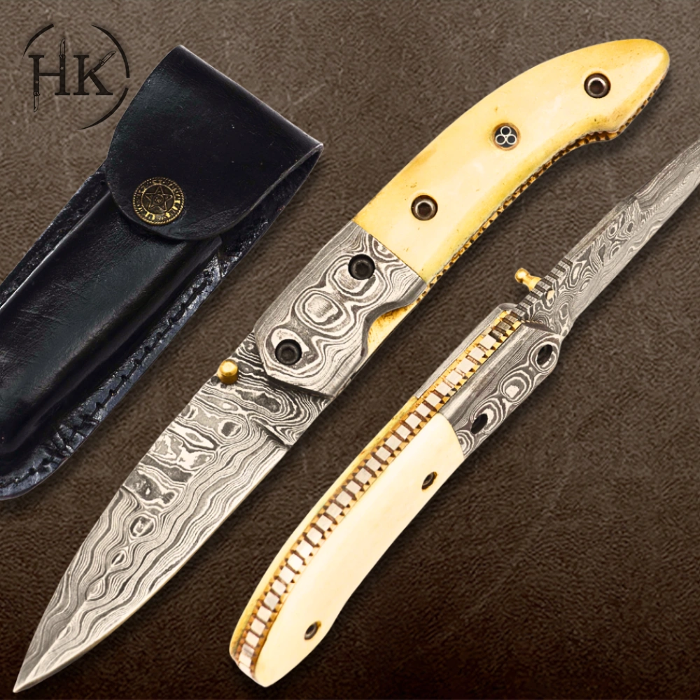 Knife enthusiasts and collectors will appreciate the unique features of this folding knife. The intricate Damascus patterns, the one-of-a-kind bone handle, and the impeccable craftsmanship make it a standout addition to any collection. Whether displayed as a showpiece or used as a reliable tool, it’s a prized possession that reflects quality and heritage.